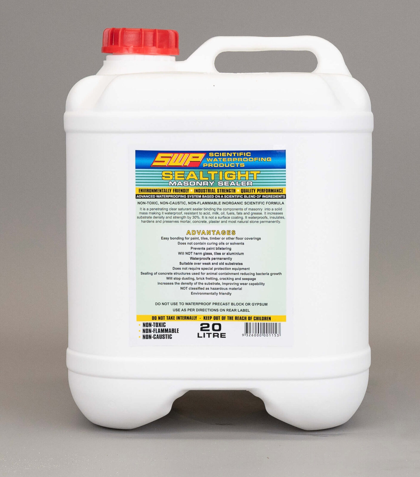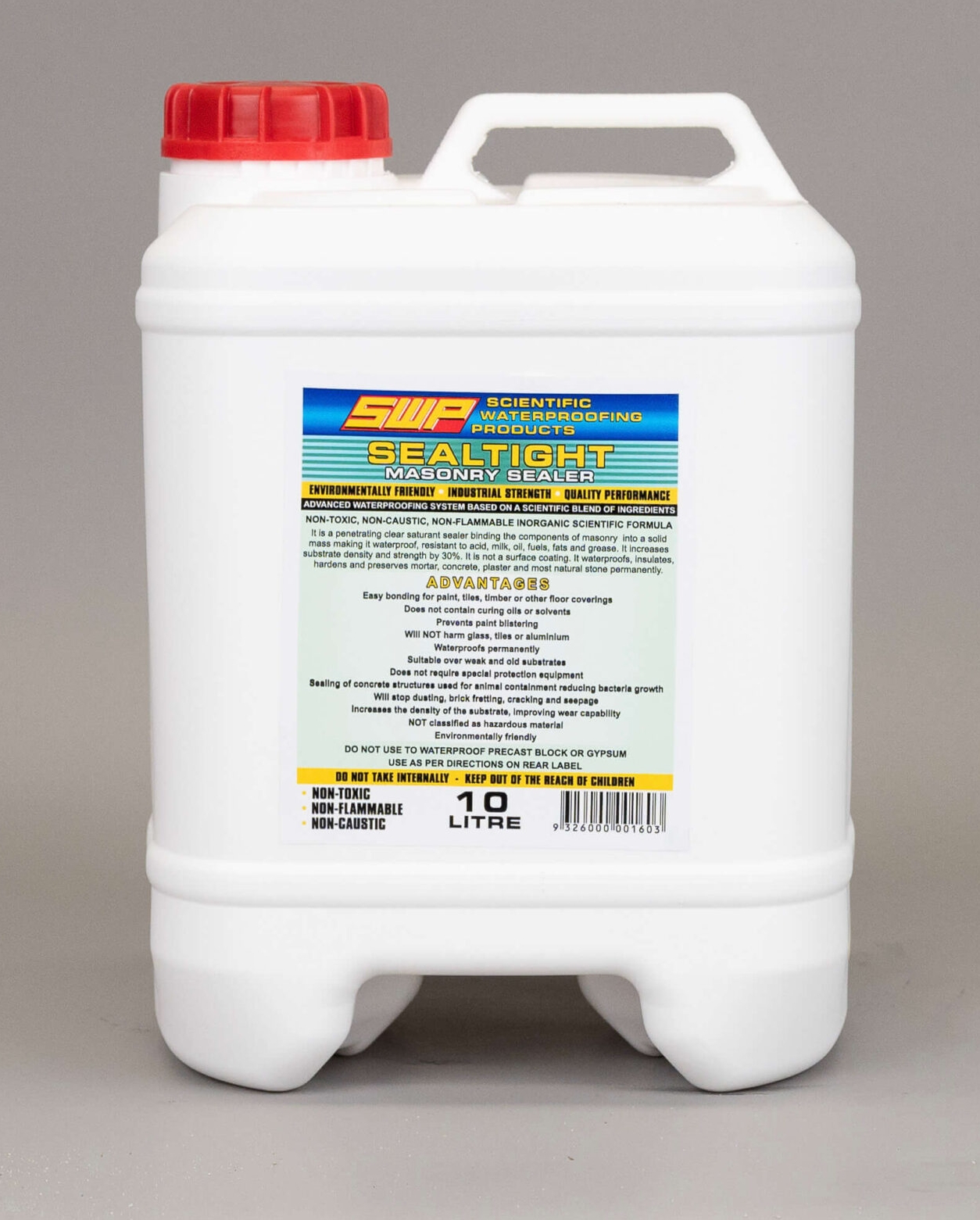 SealTight Clear applied to the masonry, concrete sealer, plaster and render Sealtight will penetrate and by a progressive chemical reaction, which is started at the surface, binds all component parts of the masonry into a more dense or solid mass. All free lime and alkali are neutralized as this reaction takes place. As the masonry increases in density, it becomes waterproof, and resistant to acid, oil and grease.